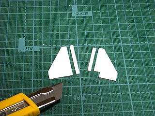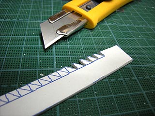 1ミリ厚のプラ板を2枚、両面テープで貼り合わせたあと、墨線どおりにカッターナイフで切り出します。力を入れてぐいっと押し切るので手は痛いわ、刃先はこぼれるわ、25ヶもあってうんざりするわで、あまり楽しくない作業です。